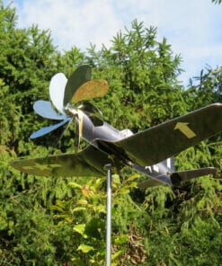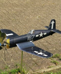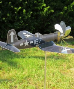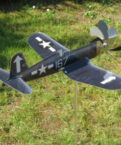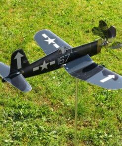 Die Corsair F4U ist eines der markantesten Flugzeuge der Welt. Um die Leistung Ihres bulligen Doppelsternmotors umzusetzen, hat sie einen riesigen Propeller. Damit der nicht den Boden berührte, bekamen die Flügel einfach den bekannten Flügelknick um damit die Propellerachse höher zu setzen. Den mächtigen Propeller haben wir auch beim maxFlite Windradflugzeug umgesetzt. Und ja, der fängt ordentlich viel Wind ein und lässt so die Windrad Corsair kraftvoll durch Ihren Garten ‚fliegen‘.