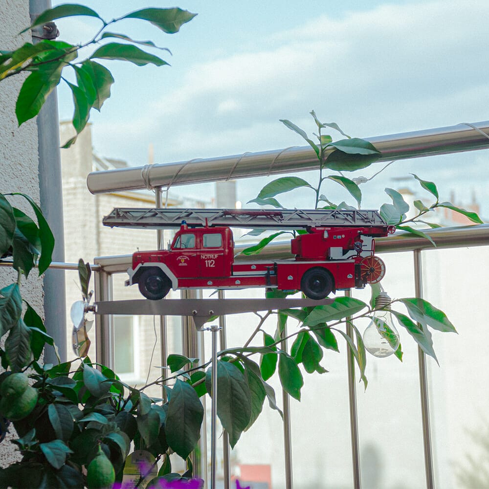 Als Windrad zur Garten- oder Balkondekoration darf natürlich ein ordentliches Feuerwehrauto nicht fehlen. Daher nun der Magirus-Deutz F 150 D 10 Einsatzwagen mit Drehleiter DL30 aus den 1960er Jahren.
