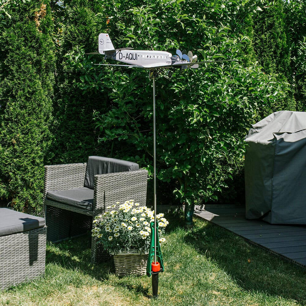 Der ,Die dreimotorige Junkers Ju 52 mit Ihrem Wellblechgewand ist sicherlich das bekannteste Passagierflugzeug der Welt. Von allen wird Sie liebevoll ‘Tante Ju’ genannt. Hört man das sonore Brummen Ihrer 3 Sternmotoren, erkennt man sofort die unverwechselbare Silhouette dieser Luftfahrtlegende. Auch beim maxFlite Windradflugzeug zur Dekoration Ihres Gartens sind die 3 Propeller das markante Erkennungszeichen.